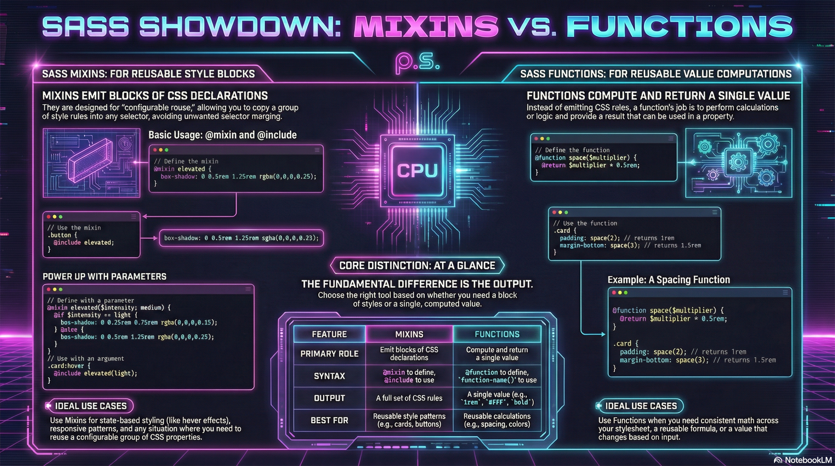 Section titled “Extra Bits & Bytes”📘 Sass Mixins versus Functions Infographic