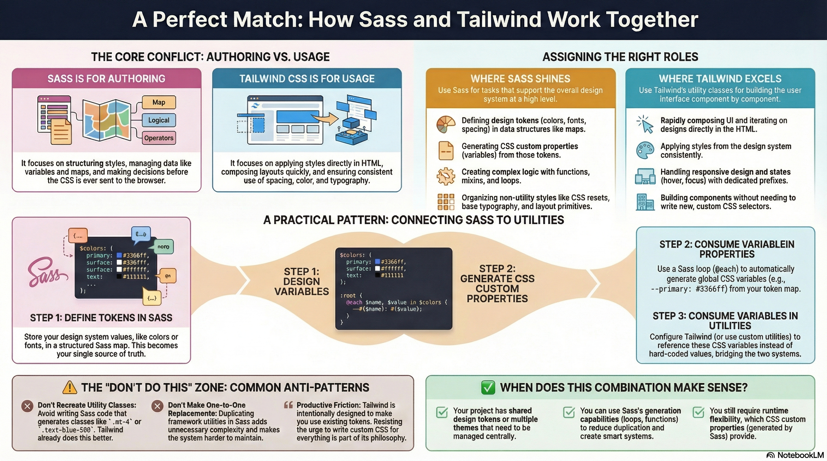 Used together, Sass supports the system, while utilities express intent in the HTML.